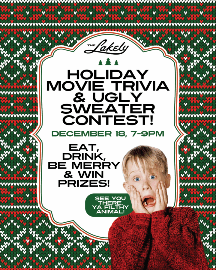 On Thursday, December 18th, Holiday Movie Trivia and an Ugly Sweater Contest collide for one gloriously competitive night from 7–9PM at The Lakely! Expect film quotes, cult classics, plot twists, and sweaters that spark conversations you didn’t ask for 🫣